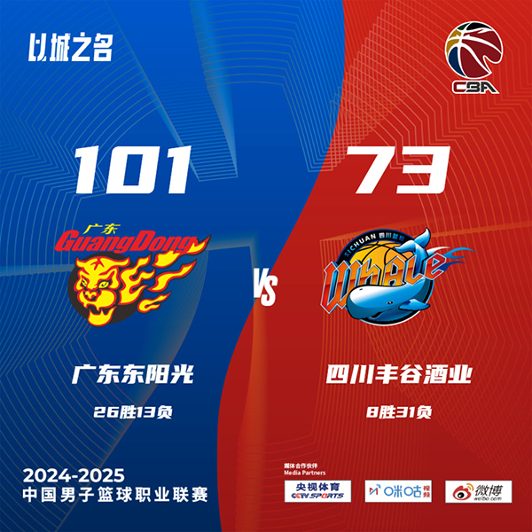 24直播网讯北京时间3月12日讯 CBA常规赛继续进行,广东主场迎战四川,广东上场大胜新疆,目前25胜13负位列联赛第6,四川苦吞9连败,8胜30负排在联赛第17位。此役一上来广东状态慢热单节仅得到16分,四川外援马里奇连投带罚接连取分,率队打出16-4梦幻开局,首节结束时四川领先9分,次节回来,广东找到进攻感觉,伯克连中三分率队回敬15-4攻击波一举反超,半场战罢,广东反超确立9分优势。易边再战后四川仅靠马里奇苦苦支撑,广东内外开花扩大优势,三节结束后广东已经领先28分,末节上来,四川进攻乏力追分无望,比赛提前失去悬念,两队陆续换上替补,最终广东101-73大胜送四川10连败。