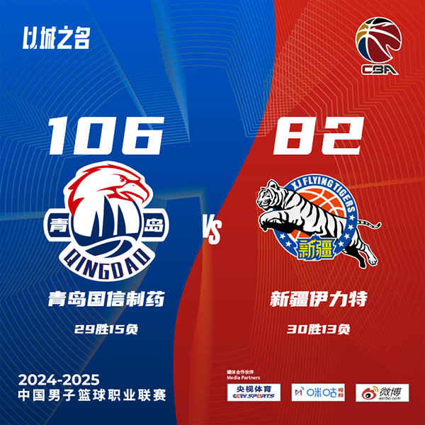 24直播网讯北京时间3月24日讯 CBA常规赛,青岛主场迎战新疆,青岛3连胜后28胜15负排在第8位,新疆则是30胜12负排在第6位。本场比赛,赵睿缺阵。比赛开始,新疆反客为主打出8-1开局,但青岛迅速调整,韦瑟斯庞里突外投连续取分,新疆外援联手也能回应,双方对攻,首节青岛领先3分,次节新疆进攻受阻,杨瀚森内线接连打成拉开双位数领先,随后新疆全民皆兵追分,半场新疆还落后6分。下半场,双方展开拉锯战,齐麟外线手感不错,但韦瑟斯庞继续神准,段昂君和杨瀚森也有得分贡献,青岛重新拉开双位数领先,末节新疆进攻端再次断电半节仅得4分,青岛13-4攻击波拉开近20分领先,双方连续打铁时间越来越少,最终青岛106-82力克新疆,拿到4连胜。