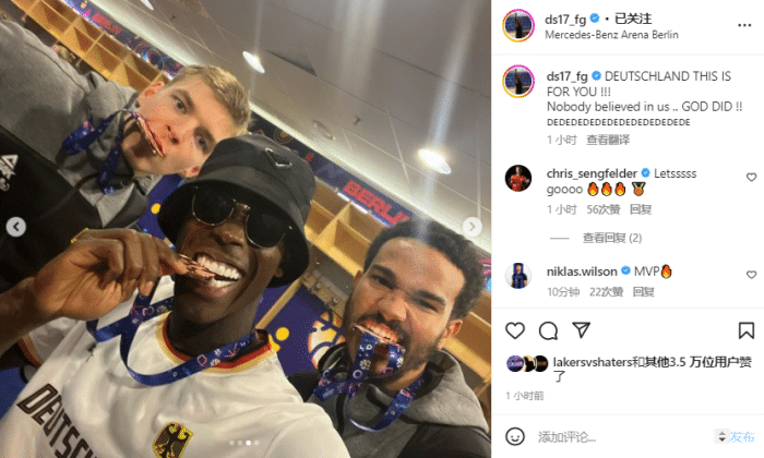 德国夺得铜牌就像夺冠似的,全队在更衣室合影庆祝,合影时施罗德躺在前排十分抢镜;施罗德还晒出他咬铜牌庆祝的画面,戴着墨镜和黑帽子咬铜牌,凸显一嘴大白牙;施罗德配文写道:德国,这是给你们的(THIS IS FOR YOU!)!没人相信我们……上帝相信。