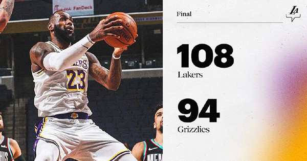 24直播网1月3日讯 湖人继续展开西南客场之旅,今天前往孟菲斯挑战伤兵满营的灰熊,此役波普和卡鲁索缺阵,库兹马首发登场。首节灰熊手感火热,琼斯、贝恩和狄龙-布鲁克斯连中三分,帮助灰熊打出一波17-0的高潮建立起两位数领先。但灰熊在次节命中率突然暴跌,湖人则找到手感,哈雷尔、浓眉哥和施罗德等轮番冲击内线得分,湖人在半场结束时以56-54反超比分。易边再战,两队在第三节打得难分难解、场上比分紧咬。不过,詹姆斯在末节开启进攻模式独砍13分,带领湖人打出一波流拉开比分。最终,6人得分上双的湖人以108-94击败灰熊,取得3连胜。