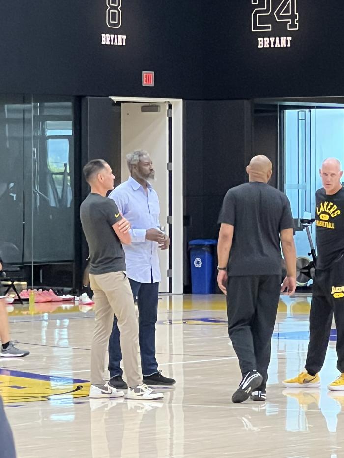 湖人新赛季训练营火热来袭,今天前NBA球员本-华莱士现身湖人训练馆,并且和贝弗利亲切交谈,大本曾和哈姆在活塞当过队友,就是湖人主帅邀请大本来的;今夏曾传出大本加盟湖人教练组的传言,最终双方并没有合作。