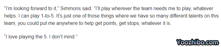 西蒙斯还表示:我们的球队有很多有天赋的球员,你可以把我放在任何地方来帮助球队得分,或者去阻截对手,无论怎样都可以。我喜欢打5号位,我不介意这一点。