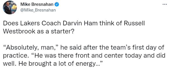 当被问及是否认为威少将会是一名首发球员时,哈姆公开表示:肯定是,他今天引领着球队,并且做得相当好,他给全队带来了很多活力和能量。