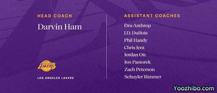 湖人新赛季主教练是达尔文-哈姆,8名助教分别是德鲁-阿索普、JD-杜比斯、菲尔-汉迪、克里斯-詹特、乔丹-奥特、乔恩-帕斯托雷科、皮特森和里姆尔。
