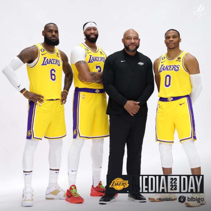 湖人媒体日,詹姆斯、浓眉和威少一起拍摄定妆照时,他们三人有说有笑十分开心,老詹笑得搂着浓眉;三巨头还和新帅哈姆一起合影,湖人官推配文写道:新的旅程开始了。