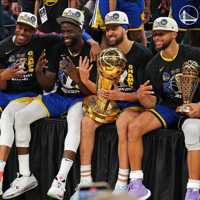 今年媒体日,库里、汤普森和格林拍摄定妆照时都和四座总冠军奖杯合影,新赛季他们将冲击生涯第5冠。