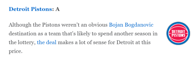 在ESPN看来,除了活塞记者Edwards提到的那些点,博扬的到期合同(1955万美元)也是一份不错的资产,至少可以换成多个次轮签,而且球风非常适合活塞的体系。活塞没有放弃太多就得到他,而且奥利尼克从火箭来到活塞后表现并不好,活塞这笔交易很成功。因此,交易评级评了A。