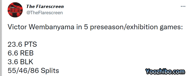 在法甲新赛季正式开打前,文班亚马已经打了5场季前赛,这5场比赛,他场均只打22分钟,贡献23.6分6.6篮板3.6盖帽,投篮命中率55%,三分命中率46%,罚球命中率86%,攻防俱佳,也难怪那么多NBA球队对他眼馋。