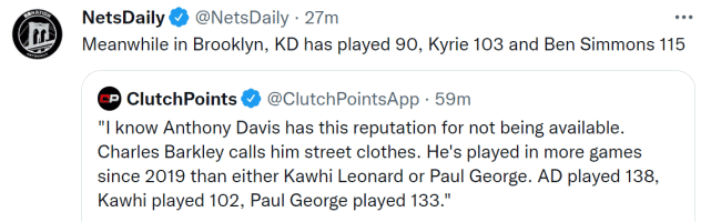 篮网媒体NetsDaily也就此话题谈到了杜兰特、欧文和本-西蒙斯的出勤率。“在这个时间段里,杜兰特打了90场,欧文打了103场,本-西蒙斯打了115场。”篮网新三巨头躺枪,他们同一时间段的出勤率也比不上浓眉。