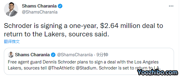 据名记Shams报道,施罗德计划与湖人队签约,他将重返湖人队。之后Shams又进一步道:施罗德与湖人签下一份一年264万美元的底薪合同。