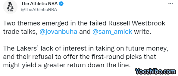 Jovan Buha与Sam Amick两大名记报道,有强烈的迹象表明威少不会被交易,在没有得到一份让湖人真正相信能让他们重回冠军争夺行列的交易前提下,威少极有可能留队。