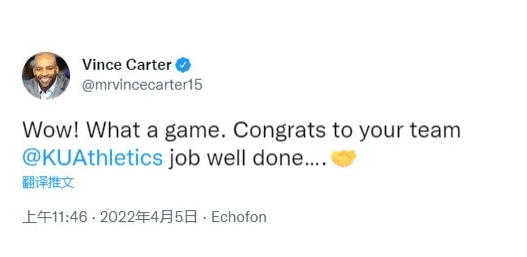 来自北卡的NBA名宿卡特发推写道:“哇!多么精彩的一战!祝贺你们的球队,堪萨斯打得很棒。”