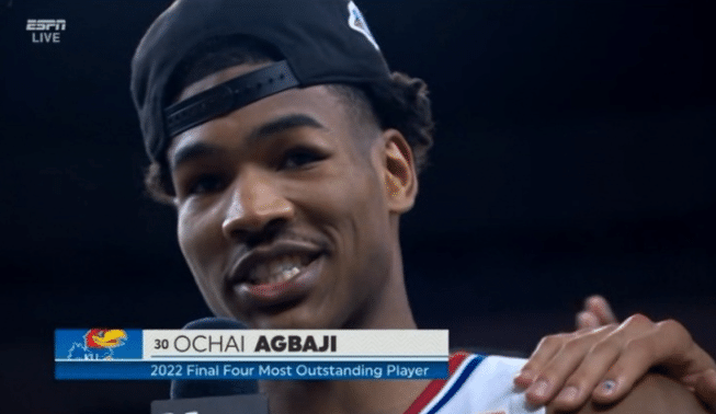 堪萨斯首发后卫、热门乐透秀阿巴吉当选MOP,总决赛他拿下12分3篮板1助攻1抢断1盖帽,表现强势。