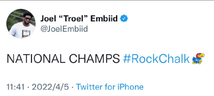 堪萨斯大学夺得NCAA冠军,同样来自堪萨斯大学的恩比德发推祝贺:全国冠军!
