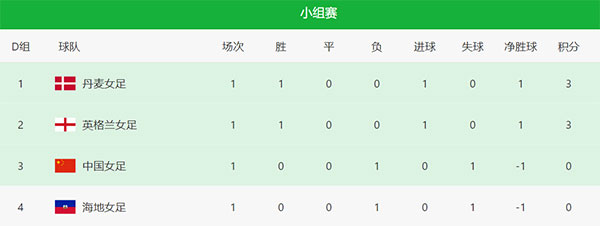 世界杯开赛前,外界一致认为同组的英格兰队很有可能三战全胜,而中国女足和丹麦队在海地身上拿分的可能性很高,但如今中国女足输了第一场与直接竞争对手丹麦队的比赛之后,需要接下来力争两连胜,一旦最后两轮3分或者4分,想要逆袭已经3分的丹麦队,难度将极大。