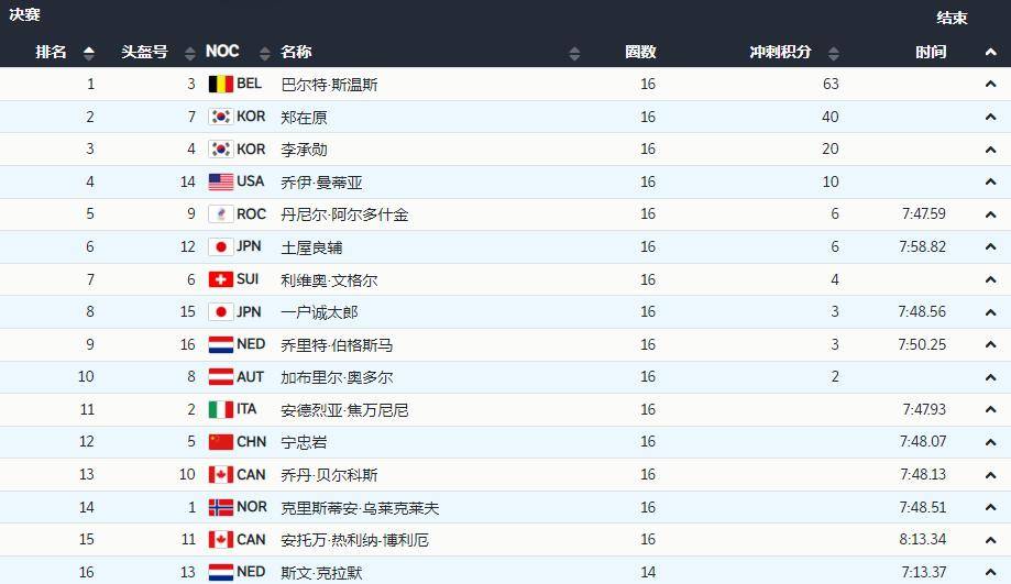 优直播讯 2月19日讯 冬奥会速度滑冰男子集体出发决赛,中国选手宁忠岩出战,最终排名第12。