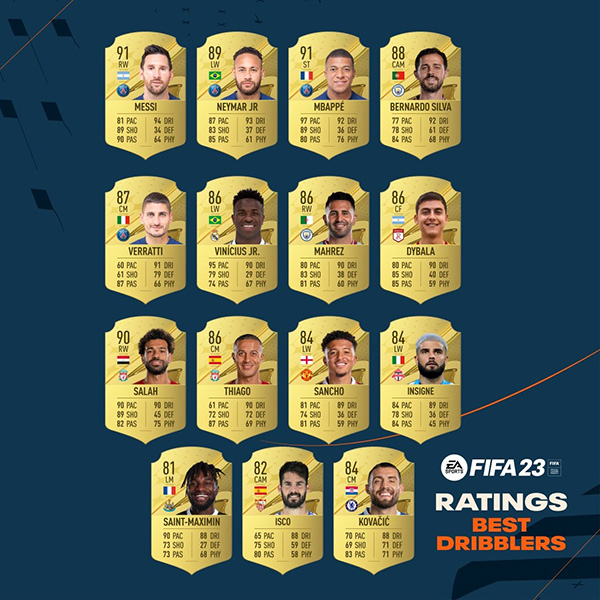 24直播网讯 9月18日讯 EA公布FIFA23盘带TOP15,梅西94居首,内马尔93第二,姆巴佩、B席92并列第三。