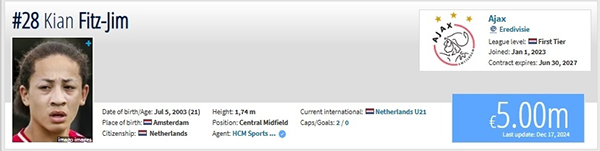 24直播网讯北京时间12月17日晚,《德国转会市场》网站更新了荷甲球员的最新身价,而备受关注的21岁华裔天才菲慈佔-天乐,最新身价已经暴涨至500万欧元。