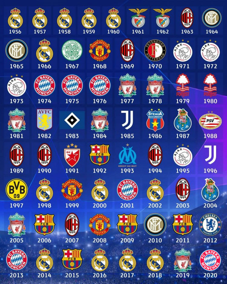 3、拜仁:6冠5亚(冠军:1974/1975/1976/2001/2013/2020)