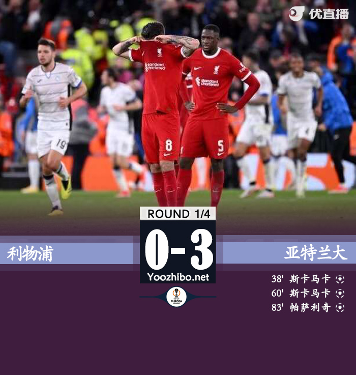 来源:24直播网04-12 09:47 24直播网讯:北京时间4月12日欧联 1/4决赛首回合,利物浦主场对阵亚特兰大。开场凯莱赫神级扑救,努涅斯丢单刀,埃利奥特中框,斯卡马卡禁区推射破门,下半场斯卡马卡梅开二度,萨拉赫破门被吹,帕萨利奇锁定胜局。最终比分利物浦 0-3 惨败亚特兰大。
