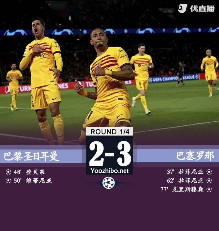 24直播网讯:北京时间4月11日欧冠1/4决赛首回合,巴黎圣日耳曼主场对阵巴塞罗那。上半场,亚马尔传中,多纳鲁马扑救不远,拉菲尼亚推射破门。下半场,登贝莱爆射破门。维蒂尼亚推射得分,巴黎两分钟迅速将比分反超。随后,佩德里助攻,拉菲尼亚不停球射门帮助巴萨扳平比分。京多安开出角球,刚刚替补登场的克里斯滕森头槌破门。全场比赛结束,巴萨客场3-2战胜巴黎,在淘汰赛中占得先机。