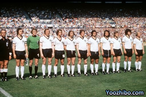 图为西德队的主力阵容,从左到右依次为:队长贝肯鲍尔、门将马耶尔、邦霍夫、博恩德、霍岑贝恩、维莫尔、“轰炸机”穆勒、奥维拉特、赫尔佐格、布莱特纳、福格茨。