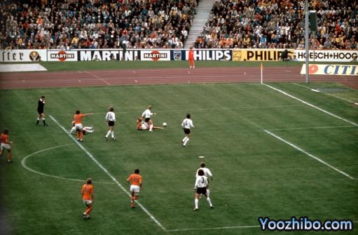 图为7月7日决赛中,克鲁伊夫开场1分钟突破获得点球瞬间,在此之前西德队员甚至尚未碰到皮球。