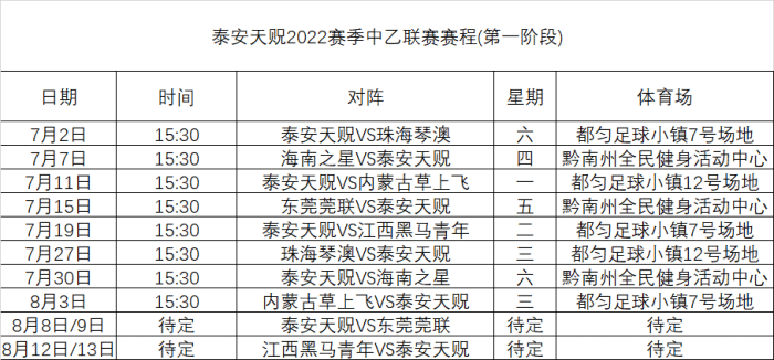 27日,中乙联赛官方公布第一阶段10轮比赛赛程,赛程显示,泰安天贶将在第一阶段先后对阵珠海琴澳、海南之星、东莞莞联、内蒙古草上飞和江西黑马青年。泰安天贶新赛季第一场比赛是7月2日15时30分对阵珠海琴澳。上赛季中冠联赛总决赛阶段,泰安天贶曾和珠海琴澳同组,当时泰安天贶2比0击败珠海琴澳,小组两连胜提前出线。如今在中乙赛场再次相遇,两队的阵容都发生较大变化,全新的对决也更有看点。
